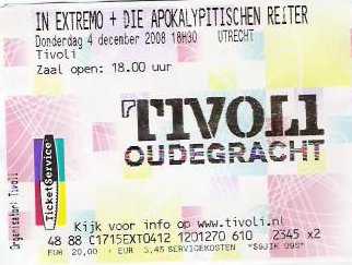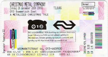 Christmas Metal Symphony in 013, oftewel metal krakers begeleid door een heus orkest. Het orkest had niet bepaald een overheersende rol het was een groot headbang feest, die gitarist van Stormrider, Marcel Coenen, blijft toch geweldig. Ook leuk om Floor van After Forever weer te zien optreden (altijd gaaf The Evil that man do cover), wordt inderdaad tijd dat AF weer eens wat van zich laat horen zoals ze zelf al zij. Doro kan ook nooit wat fout doen. Russel Allen helemaal top, ook een Ayreon cover. Heb ook nog Paranoid gehoord van Black Sabbath. Kon me toch niet op de naam van Tiamat komen, gelukkig waren erbij de garderobe ook mensen die hun geheugencellen niet hadden vernietigd, waarvoor dank. En op de terugreis in de trein komen we gewoon Dikke Dennis nog tegen. Geweldige concertafsluiter van het jaar!!