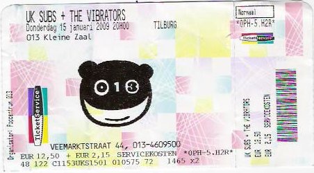 De legendarische Punk rockers van de Subs spelen zowaar in 013 in Tilburg weliswaar in de kleine zaal. Eerst weer wat NS perikelen, treinverkeer van Utecht naar Nijmegen geblokkeerd dus iedereen wordt omgeleid over Den Bosch, dus extra druk richting Den Bosch. Leuk ook dat de boemel die je dan probeert te halen klakkeloos wegrijdt terwijl er een peleton in gestrekte draf die trein probeert te halen. Goed iets later dan gepland in Tilburg, nog even knabbelen en dus hebben we de Vibrators gemist. Onder het eten was de grap dat als we binnenkomen ze het laatste nummer inzetten, en jawel "this is the last one" klinkt het als we net het eerste biertje bestellen. Best jammer, want eigenlijk is het wel een legendarische band. Zanger Charly Harper
