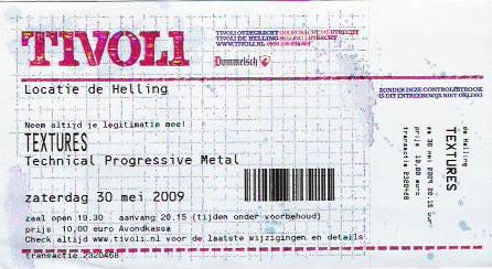 Na een fietsongelukje de dag ervoor wat gehavend met m'n arm in mitella naar een concert van Textures. Dat werd dus achteraan de bar hangen i.p.v. vooraan beuken. Toch was het een geslaagd concert. Fraai Textures shirtje gescoord. De uitsmijter had wat moeite om de twee personen met mitella uit elkaar te houden gezien de vraag "jij was toch al buiten" toen ik naar buiten wilde lopen :-)